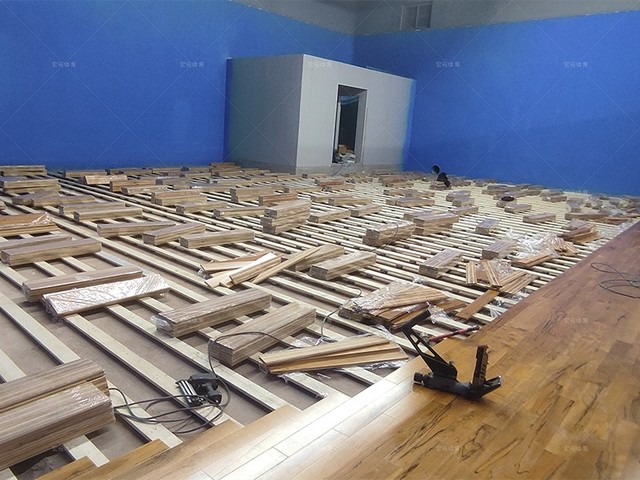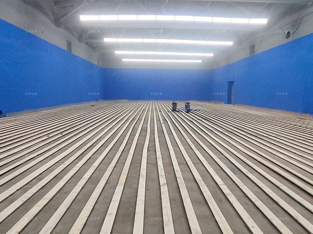 場地整體鋪完在運動長條燈光的映襯下,加黃色的面板和深藍色的墻體搭配的更加貼合,可以很好的起到放松運動員視力的作用