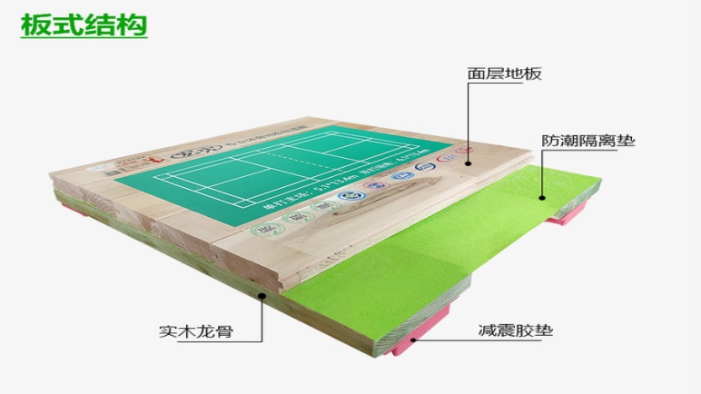 懸浮式單層板式結構是一種具有高舒適性性、環保經濟的一款運動木地板系統。采用板式龍骨層架空,適用于羽毛球場地,健身房,乒乓球場地。特別是場地標高不夠的運動場所。整體運動木地板高度5厘米。
