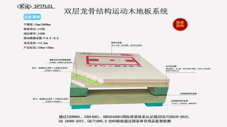 雙層板上下龍骨雙彈結構高吸震性和連續回彈性的固定懸浮式的運動木地板系統,適用于國內,國際比賽。