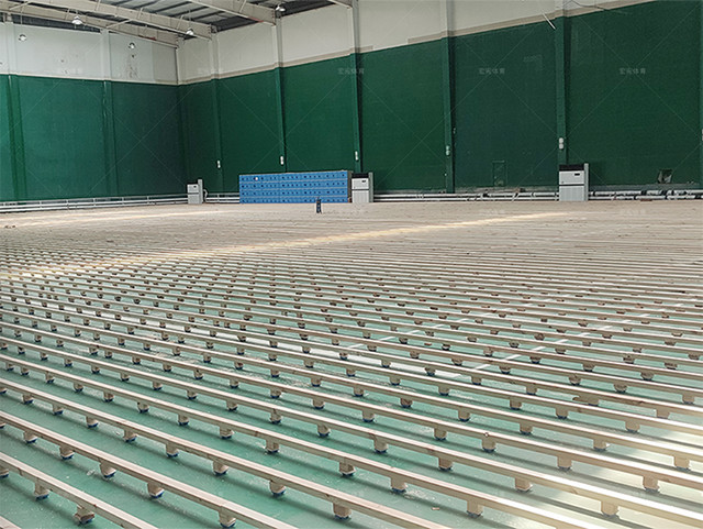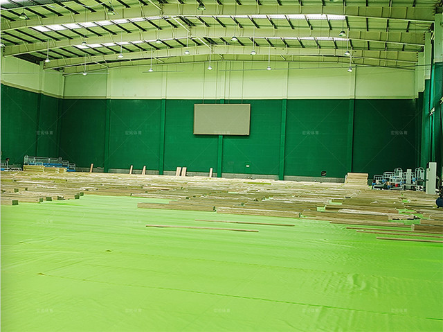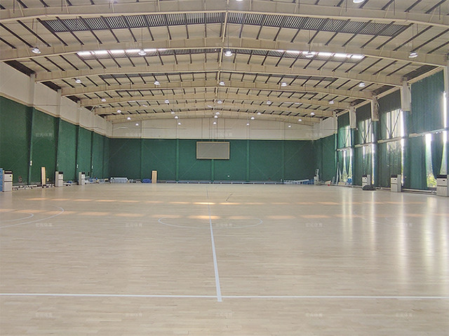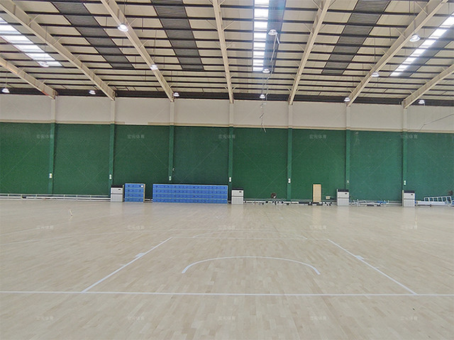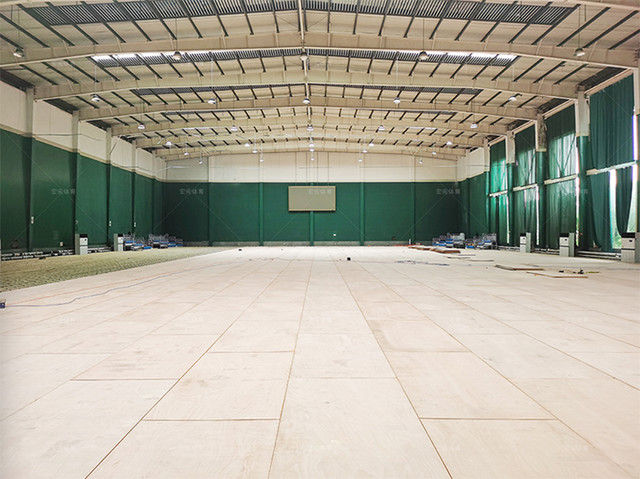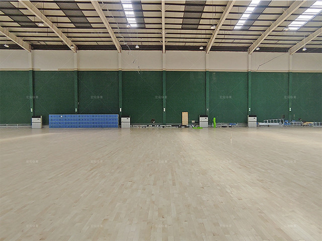 場館采用楓樺木A級面板,單層龍骨結構。面板光潔無色差、無結疤、無黑色礦物線,給人很好的視覺體驗,場館底層采用烘干防腐龍骨,防止蟲蟻滋生,進一步延長木地板的使用壽命;毛地板采用二次成形的實木多層板,使場館更加平整,無紡布為加淋膜無紡布,防潮效果更佳。整體鋪完,不僅使用效果好,而且原木色的地板和墨綠色的墻體背景可以很好的緩解視覺疲勞,給運動員帶來更好的運動體驗感。