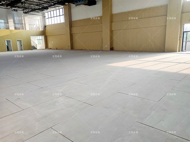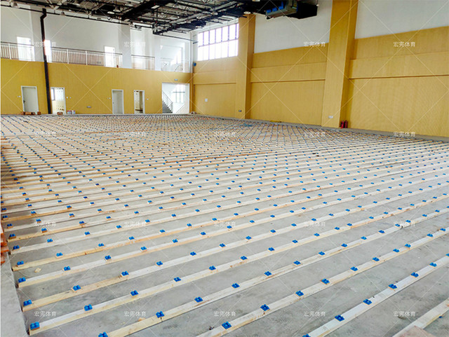 場館采宏憲SPTFL04系統,標高為9cm,整體結構性價比較高。底層采用烘干防腐松木實木龍骨,防腐、防潮、抗蟲蟻。采用整版整芯、二次成形的實木多層板,無空鼓更耐用,平整度更好。采用防潮隔音效果更佳的淋膜無紡布做為防潮隔離墊,面板為加黃色B級楓樺木面板,和場館黃色的背景墻體相呼應,增加增加地板的美觀性。