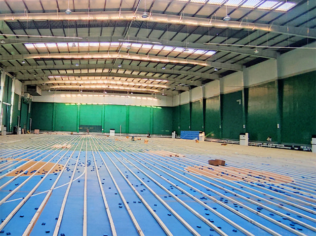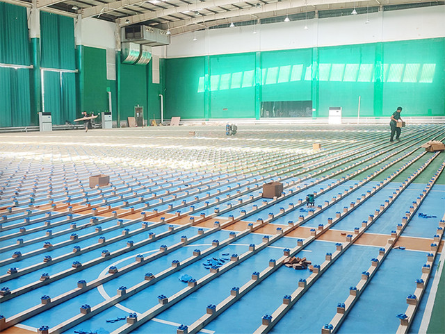 襄都區體育館運動木地板鋪設施工中。