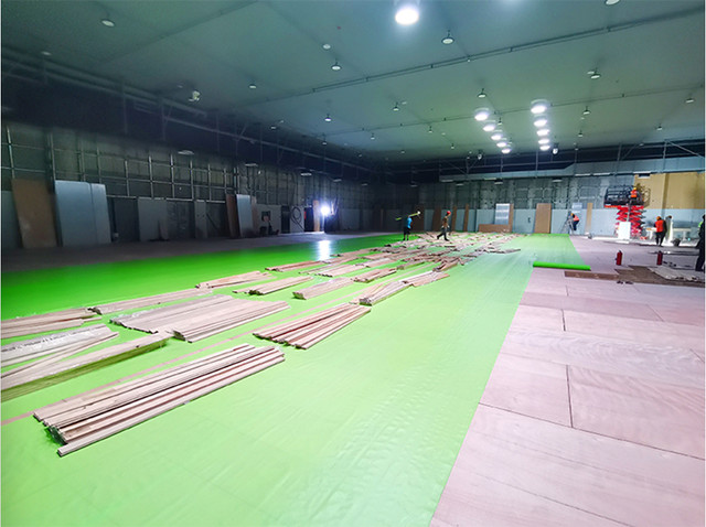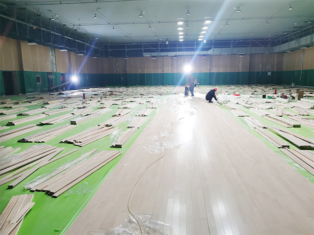 襄都區體育館運動木地板鋪設施工中。 烏魯木齊第五十八中學體育館木地板7.15日完工