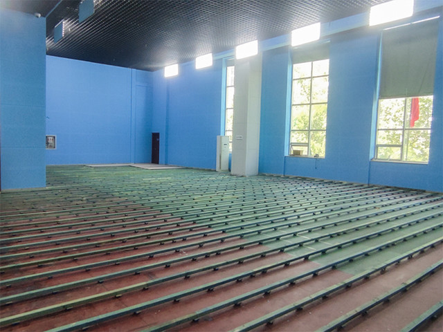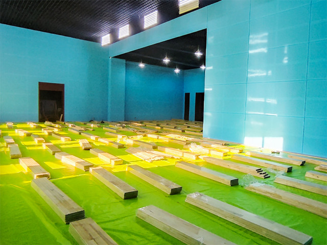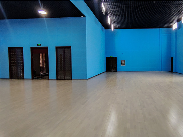 共歷時4天,場館底層采用單龍骨結構,使用烘干防腐松木龍骨保證場館不易潮濕、生蟲蟻,面層采用楓樺木A級面板,屬于運動木地板中面板外觀等級較高的,面板紋理清晰,整潔無瑕;場館右側墻體雖然是半弧形狀,不易鋪地板,但施工師傅結合過往的經驗和專業的技術完成了鋪設,把控細節,精益求精。整體地板搭配藍色墻面背景使場館更加簡約大氣。