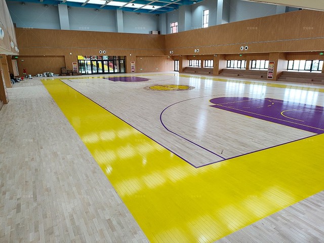 華山中學籃球館木地板完工!場地共1100平米 位于新疆巴音郭楞庫爾勒市 采用楓木A級面板,相對于楓樺木面板硬度更高,更耐磨,達到專業的體育賽事標準。底層結構使用雙層龍骨結構,兩層龍骨固定整體地板更加穩固,底層空間較大,不僅通風性能更好而且擁有較好的減震緩沖性能,對運動員有一定的保護作用。