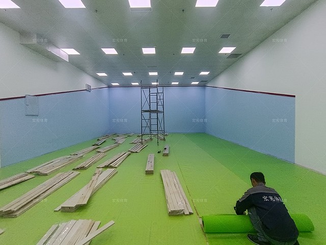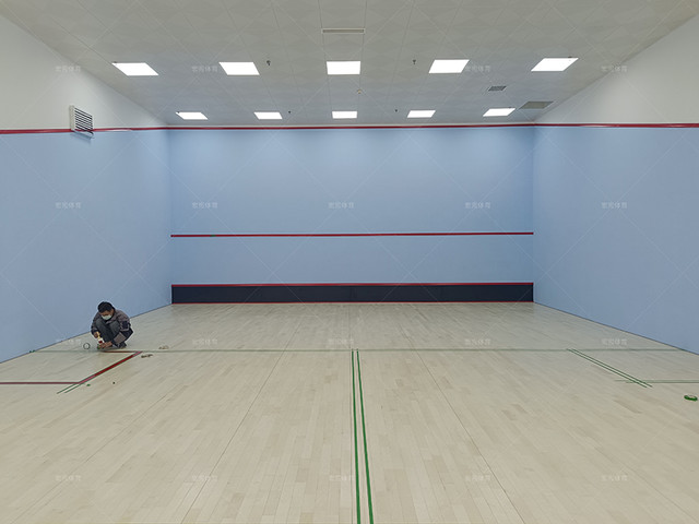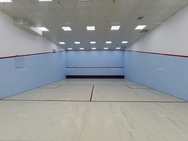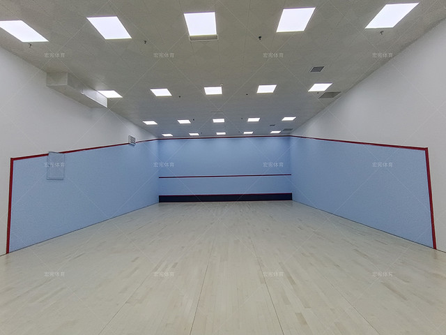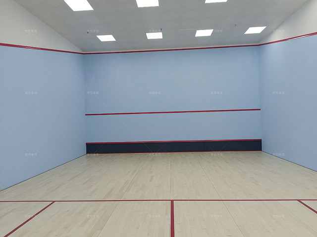 場地整體規劃為兩個批蕩式壁球館,一個為面積較大的非標準壁球館,另外一個為標準的雙打壁球館,場地在壁球館區域以及走廊區域全部鋪設楓樺木A級面板,單層龍骨結構,墻體采用專業壁球館的抗擊打材料,硬度更高,可達到壁球比賽要求。