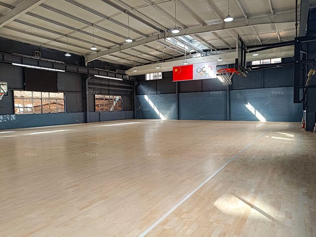 山西800平米新動力籃球館完工,該場館為一個標準的個人廠房改造,不僅要注重打球的效果,還要在此基礎上最大程度的節約成本,采用主廠區為楓樺木A級面板,邊上緩沖區為楓樺木C級面板的方案,底層使用宏憲專利膠墊,達到E1級環保,抗壓耐用。