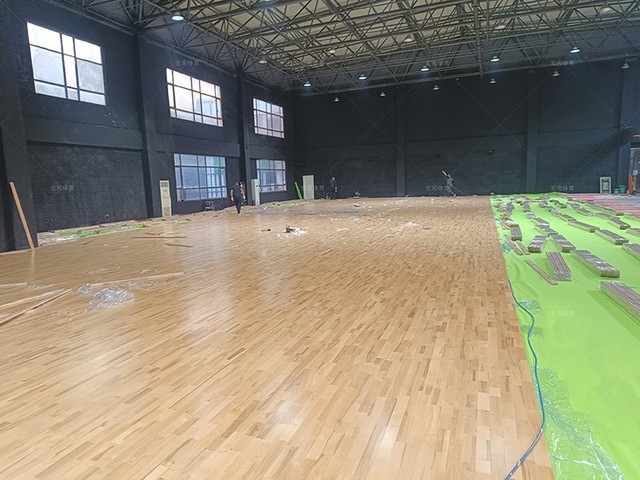 湖北瑞天廣場籃球館運動木地板鋪裝中,采用楓樺木B級SPTFL02結構~,宏憲體育一定會全力以赴不辜負客戶的信任高質量的交付,期待最終完成效果~